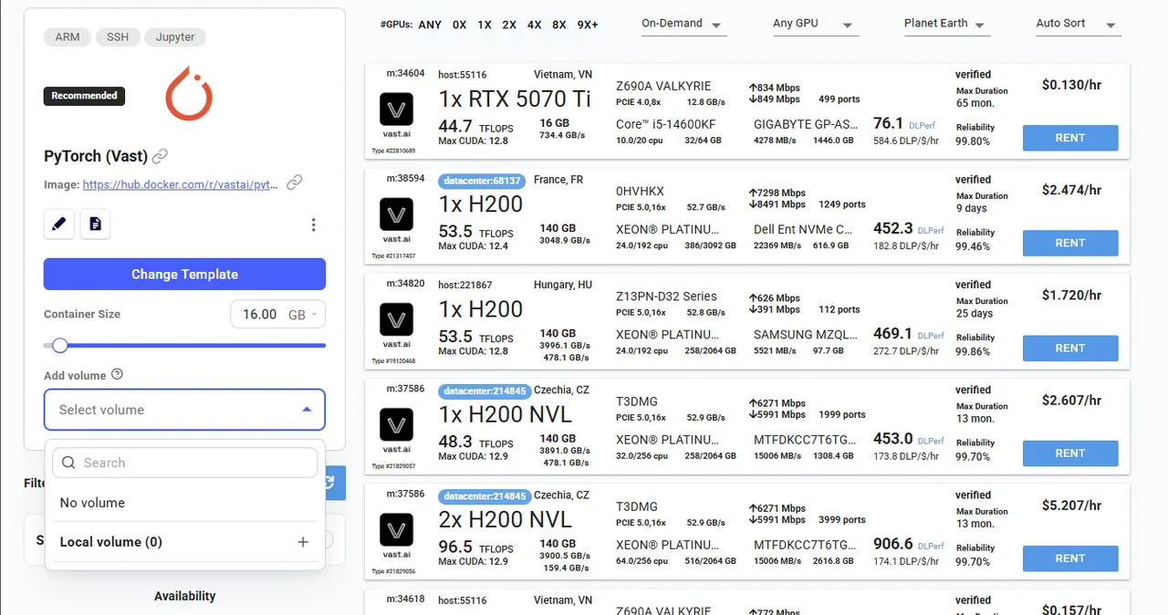 Click Rent button to launch your instance along with the volume. Once the instance is running, your volume will be automatically mounted and available inside the container at the /data directory.