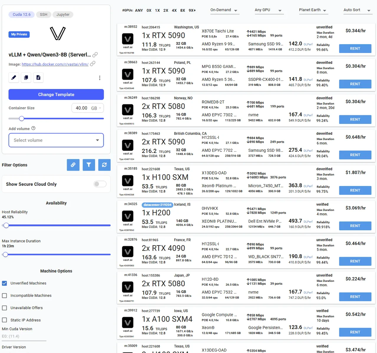 We should now see the Vast.ai search page with the template selected. For those intending to use the Vast CLI, click More Options on the template and select ‘Copy template hash’. We will use this in step 3.
