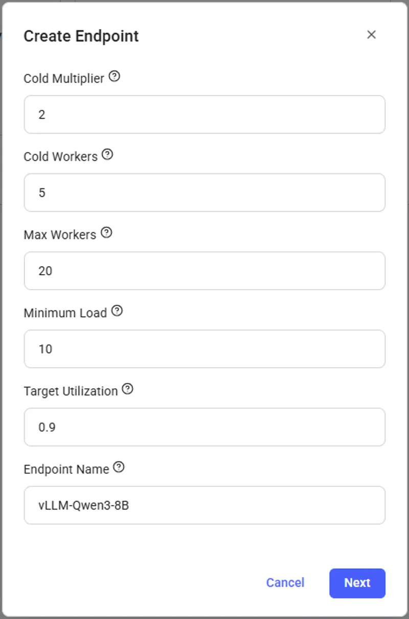 endpoint_name: The name of the Endpoint.cold_mult: The multiple of the current load that is used to predict the future load. For example, if we currently have 10 users, but expect there to be 20 in the near future, we can set cold_mult = 2.- For LLMs, a good default is 2.