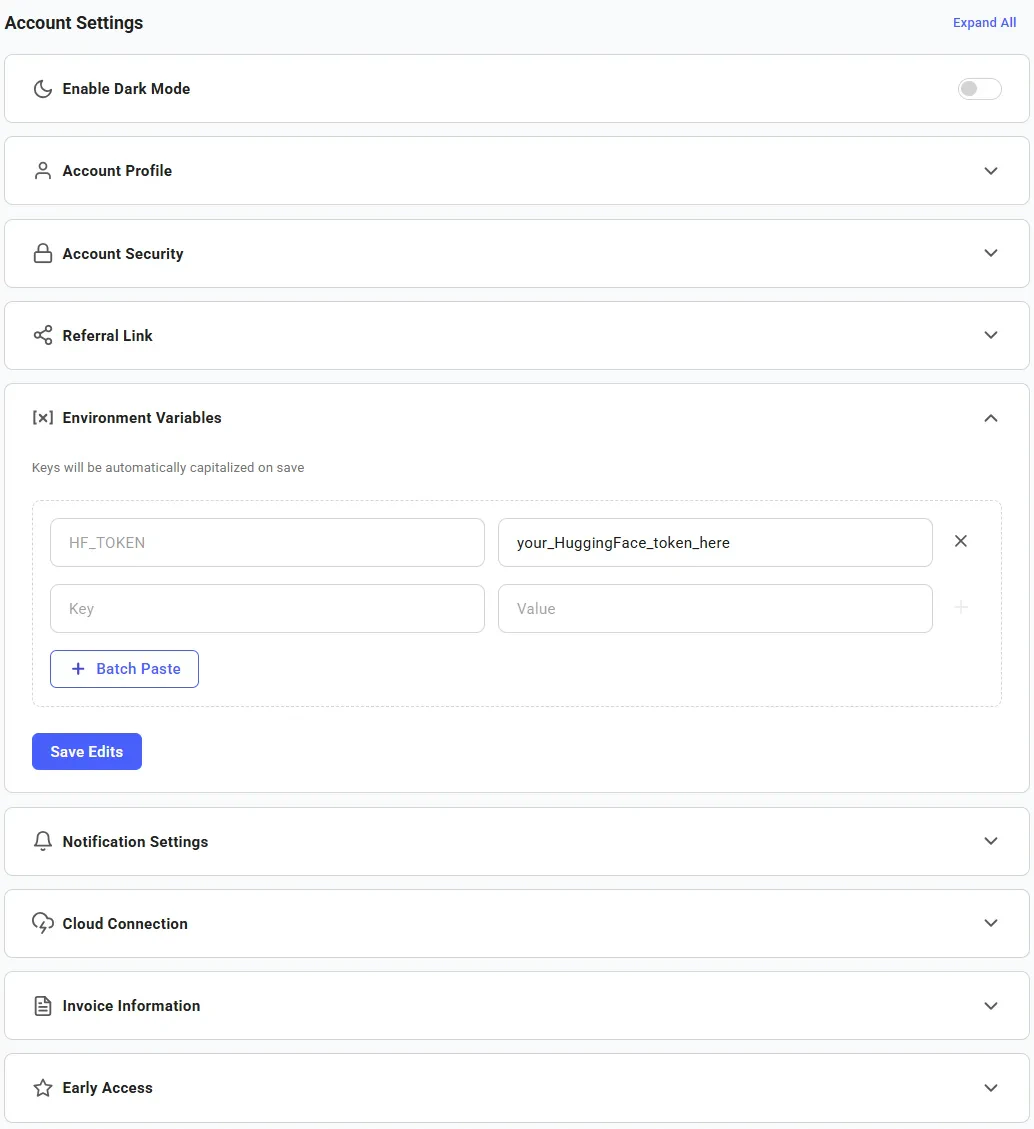 Navigate to the user account settings page here and drop down the “Environment Variables” tab. In the Key field, add “HF_TOKEN”, and in the Value field add the HuggingFace read-access token. Click the ”+” button to the right of the fields, then click “Save Edits”.