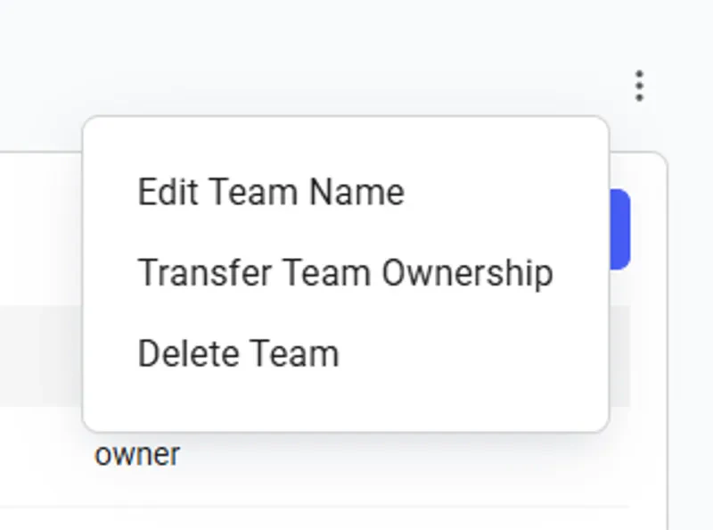 The Transfer Team Ownership feature allows an owner to seamlessly reassign the team to another member within it. To do so, navigate to the Members page and click the three-dot menu in the upper right corner.