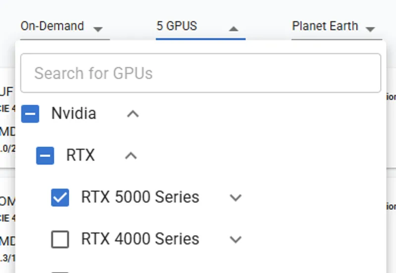 3. Select the 5 series GPU from search filters In the GPU drop down menu select the specific 5 series card you want to rent or select the whole category.
